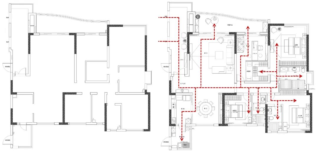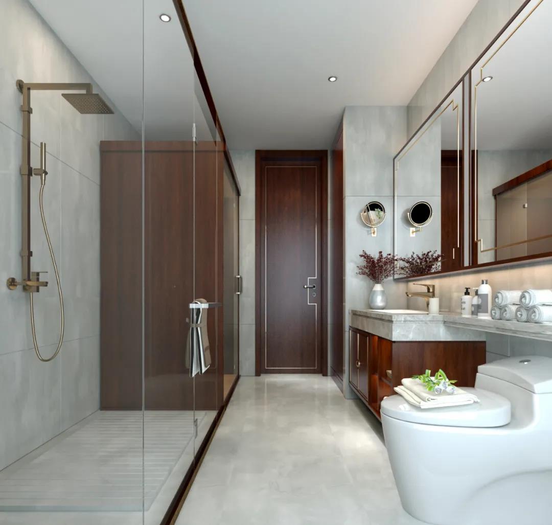 主臥床頭山水畫再次點(diǎn)明新中式主題,深棕色墻面與白色墻面中和,厚重也不失飄逸。無主燈設(shè)計(jì)讓室內(nèi)光線更加柔和,主人在此休息睡眠體驗(yàn)更好。衛(wèi)生間做干濕分離,便于保持清潔,淋浴室做防滑設(shè)計(jì),小細(xì)節(jié)很重要。