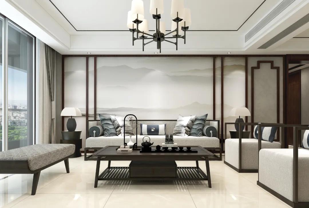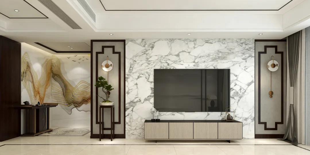 客廳設(shè)計(jì)上采用濃厚的新中式元素,不論是墻面的山水畫、還是線條勾勒如窗欞的花紋裝飾,無一不透露著中式獨(dú)有的詩畫韻味。電視墻采用大理石花紋,靈動(dòng)自然、奢華尊貴,再加以盤虬盆栽,打造出極富古典氣息的空間氣質(zhì)。