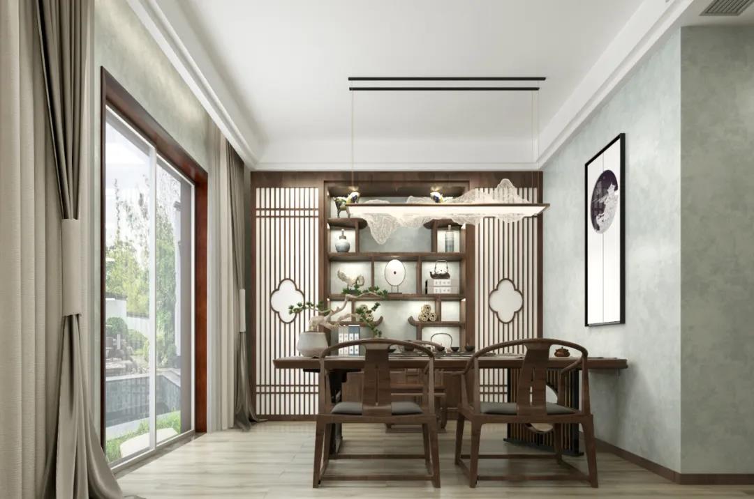 獨(dú)立茶室既是待客休閑之所,也能作書房之用。仿古典柜體的設(shè)計(jì)與山水式吊燈映襯,室內(nèi)空間嫻靜雅致,恍惚已有茶香滿室。