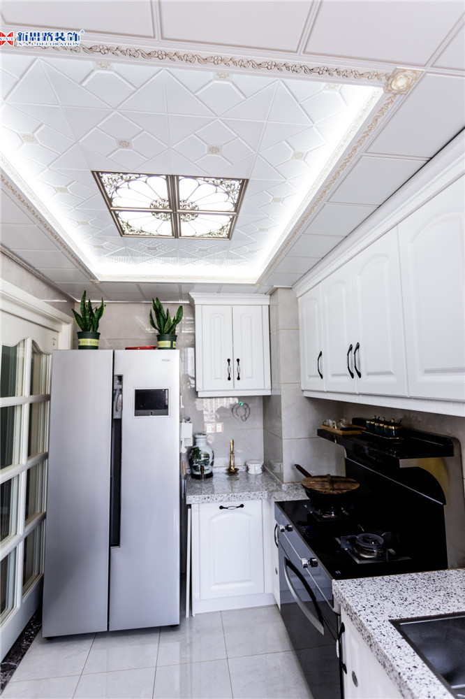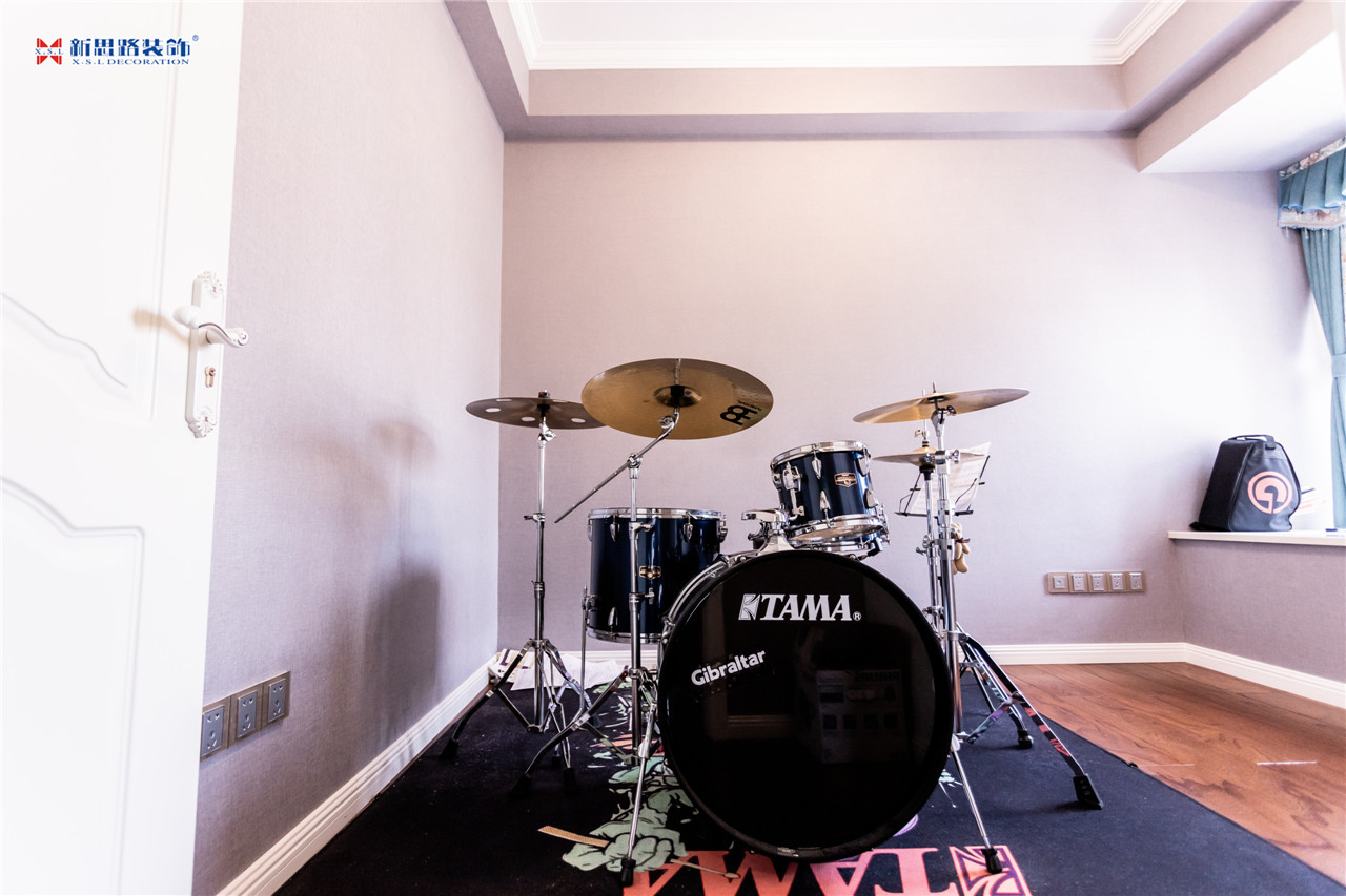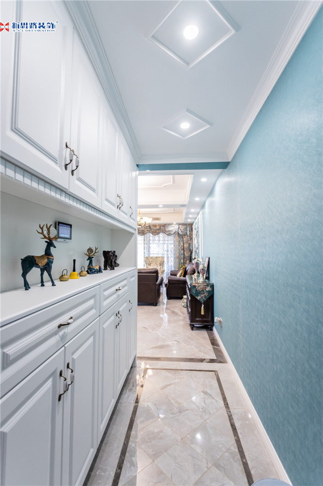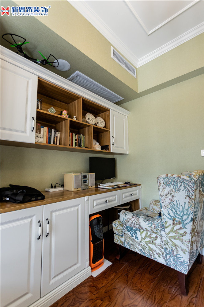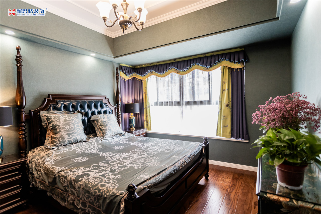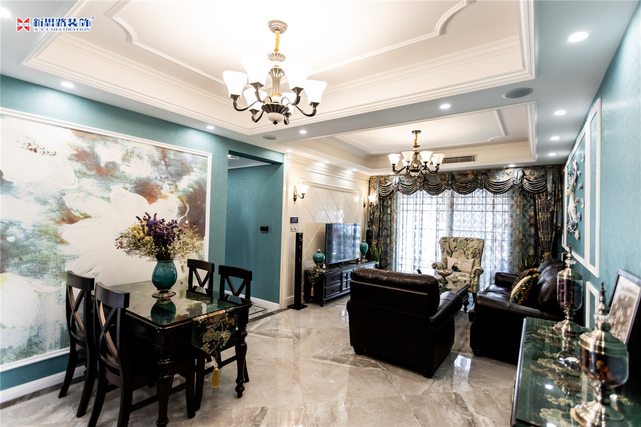 沙發(fā)背景墻使用石膏線材勾畫幾何圖形,古典優(yōu)雅;陶瓷的小鹿漫步花間,野趣橫生。復(fù)古花色的窗簾與真皮質(zhì)地的沙發(fā)以及實(shí)木電視柜搭配起來(lái)正合適,線條分割成菱形網(wǎng)格狀的乳白色電視背景墻大方低調(diào),黃銅色美式吊燈干凈明亮。深墨綠色的織錦桌旗無(wú)形中又添了點(diǎn)奢華意味,油青色的仿古裝飾擺件也是非常經(jīng)典的美式元素體現(xiàn)。