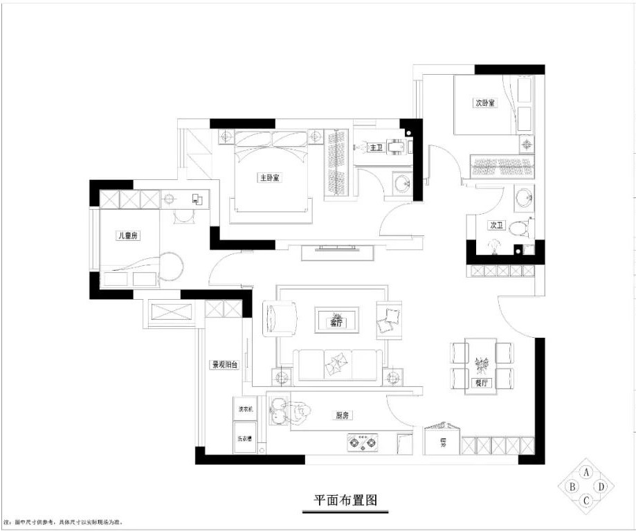 該房屋戶型面積較小,只有80m2,并且還是三室二廳,導(dǎo)致每間屋子的空間都較為局促。因此,進(jìn)行設(shè)計(jì)的時(shí)候,我們需要考慮到空間利用的問題,將有限的房屋面積充分利用起來(lái)。同時(shí)也要符合用戶的需求,在利用空間之余給兒童留下活動(dòng)的區(qū)域。