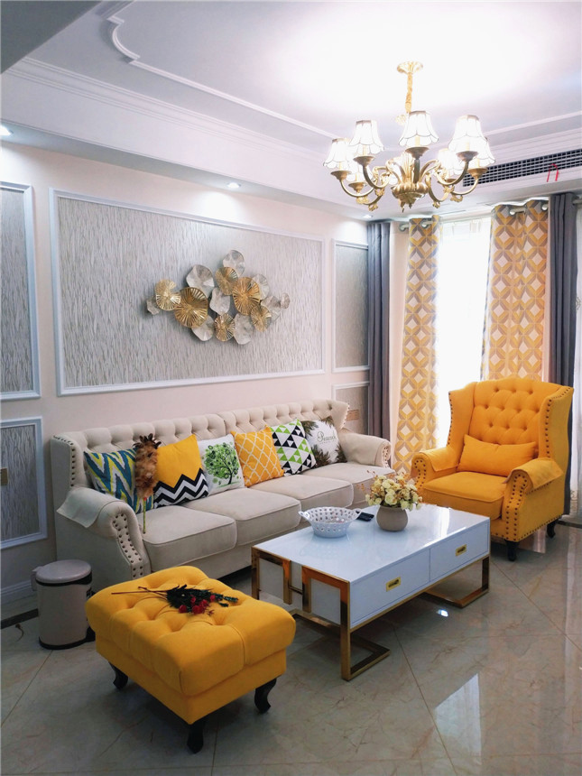 柔軟的布藝沙發(fā),是營(yíng)造溫馨氛圍的不二之選。沙發(fā)的顏色選取了簡(jiǎn)單的白色和明快的姜黃色,不經(jīng)意間流露出活潑的氣氛。金屬的墻面飾品與金屬銅色的燈具相得益彰,彎曲的弧度與圓環(huán)的形狀讓它們不會(huì)顯得過分生硬,而是在現(xiàn)代的氣氛中恰到好處地融入了一絲古典氣息。隨處可見的仿生花點(diǎn)綴了各個(gè)角落,為屋里增添了不少活力,更添溫暖與柔情。