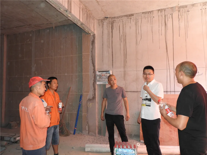 工程部經(jīng)理等人在送水的同時也與工人交流施工的問題