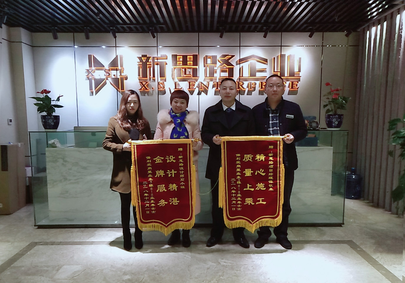 2018年12月7日下午,來自保利愛尚里的業(yè)主牟老師專程來到南坪總部將一面印有“設計精湛,金牌服務”的錦旗交給我們設計師石小婭手中,又將一面印有“精心施工,質量上乘”的錦旗交到我們項目經理譚欽術手中,以感謝新思路裝飾高品質工藝和優(yōu)質貼心的服務。