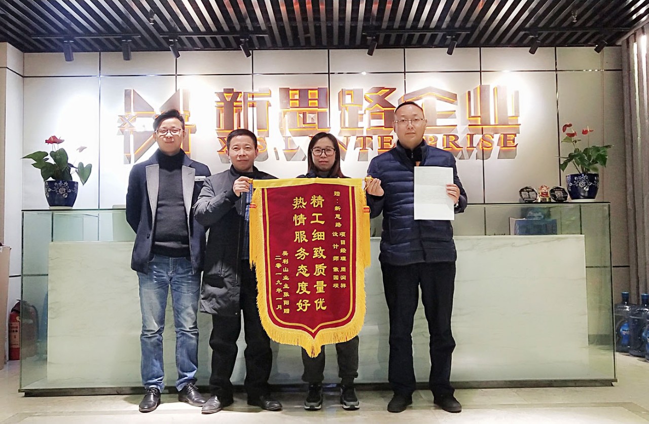 2019年1月23日下午,來自美利山業(yè)主張老師專程來到南坪總部,將一面印有“精工細致質(zhì)量優(yōu),熱情服務(wù)態(tài)度好”的錦旗交給我們的設(shè)計師敖組長和項目經(jīng)理周經(jīng)理手中,以感謝新思路裝飾高品質(zhì)工藝和優(yōu)質(zhì)貼心的家裝服務(wù)。