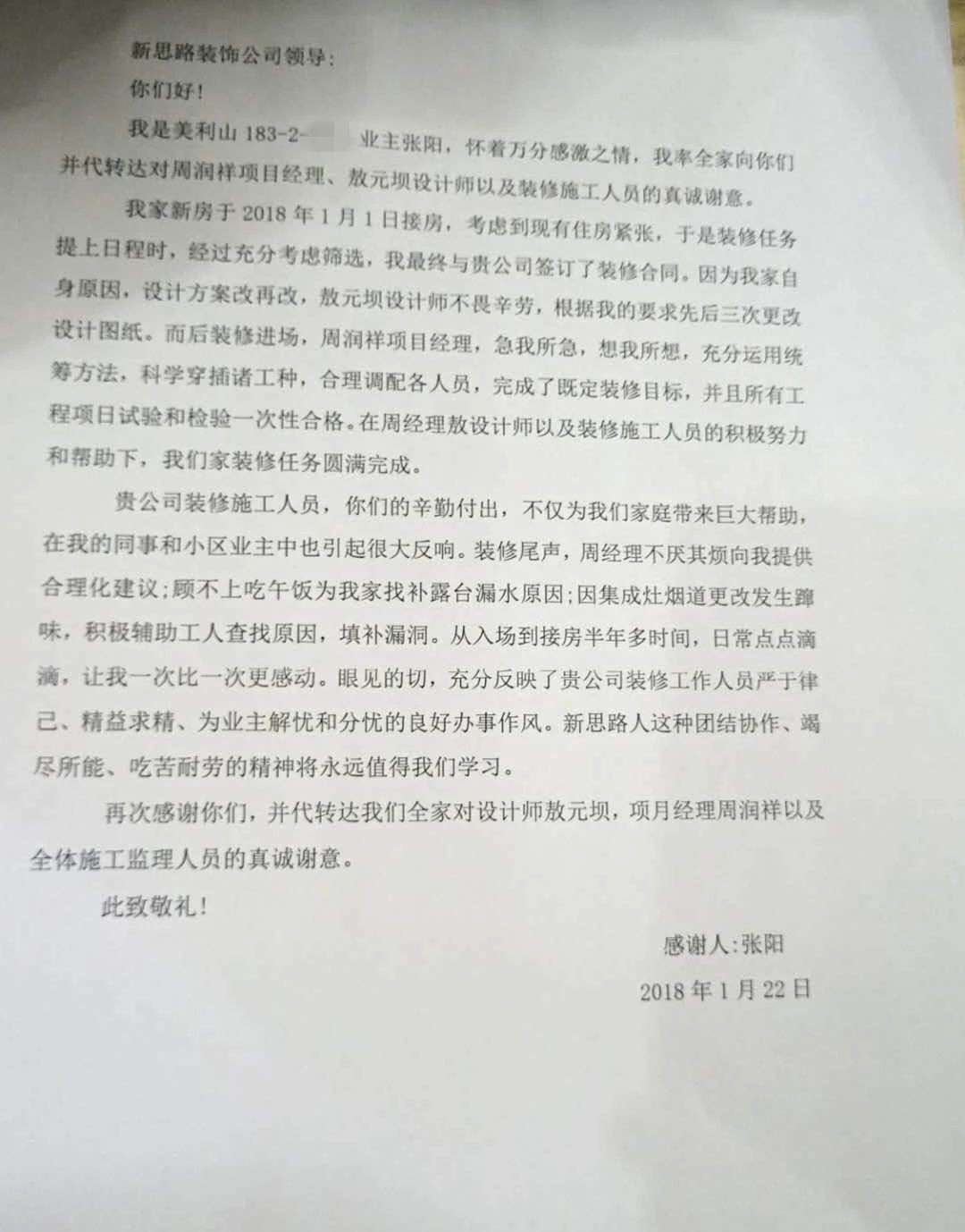 張老師說到:“我家新房于2018年1月1日接房,考慮到現(xiàn)有住房緊張,于是裝修任務(wù)提上日程時,經(jīng)過充分考慮篩選,我最終與貴公司簽訂了裝修合同。因為我家自身原因,設(shè)計方案改再改,敖設(shè)計師不畏辛勞,根據(jù)我的要求先后三次更改設(shè)計圖紙。而后裝修進場,項目經(jīng)理周經(jīng)理,急我所急,想我所想,充分運用統(tǒng)籌方法,科學(xué)穿插諸工種,合理調(diào)配各人員,完成了既定裝修目標,并且所有工程項目試驗和檢驗一次性合格。在周經(jīng)理敖設(shè)計師以及裝修施工人員的積極努力和幫助下,我們家裝修任務(wù)圓滿完成。貴公司裝修人員,你們的辛勤付出,不僅為我們家庭帶來巨大幫助,在我的同事和小區(qū)業(yè)主中也引起很大反應(yīng)。從入場到接房半年多時間,日常的點點滴滴,讓我一次比一次更感動。眼見的一切,充分反映了貴公司裝修工作人員嚴于律己、精益求精、為業(yè)主解憂和分憂的良好辦事作風(fēng)。真的,再次感謝你們,并代轉(zhuǎn)達我們?nèi)覍Π皆O(shè)計師和項目經(jīng)理周經(jīng)理以及全體施工監(jiān)理人員的真誠謝意!“