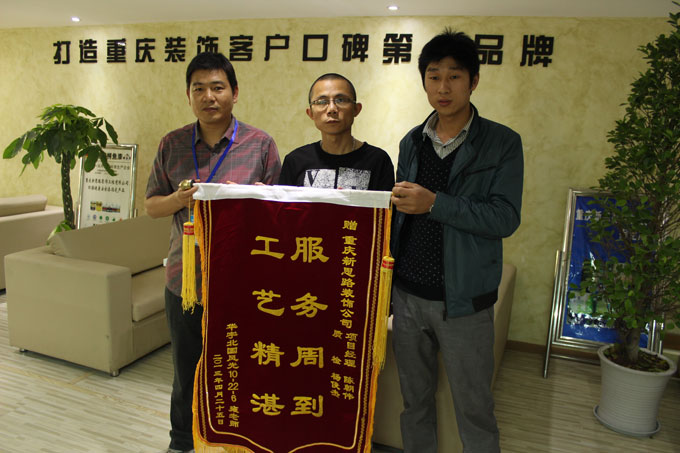 拿著這幅沉甸甸的錦旗,大家臉上都露出了欣慰的笑容,這不僅是對新思路裝飾“放心裝修、品質(zhì)裝修”服務(wù)的高度認(rèn)可,更是推動我們向更高的目標(biāo)邁進(jìn)的強(qiáng)大動力。我們一定會再接再厲,以打造重慶裝飾客戶口碑第一品牌為目標(biāo),服務(wù)好每一位業(yè)主,把每一位業(yè)主的家當(dāng)做自己的家來設(shè)計(jì)和裝修,用信譽(yù)、質(zhì)量以及貼心的服務(wù)打造更多的精品工程,放心工程,來回報(bào)我們的客戶。