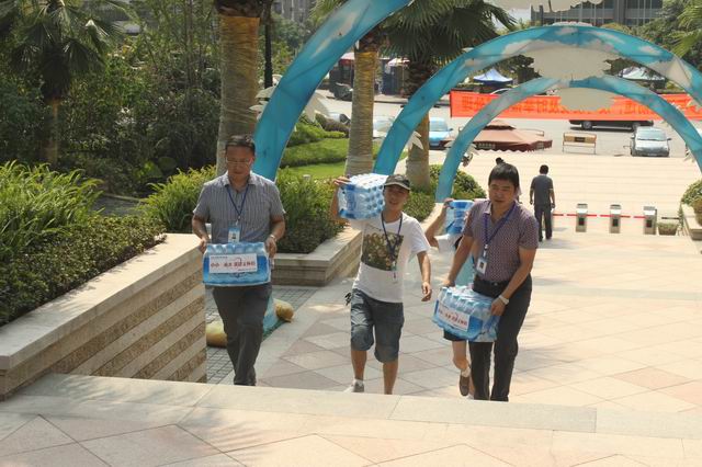 張總親自將礦泉水送到工人手中