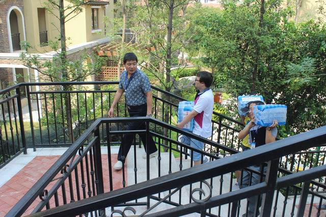 張總及慰問小組一行扛起水向東方雅郡小區(qū)施工工地進(jìn)發(fā)送水