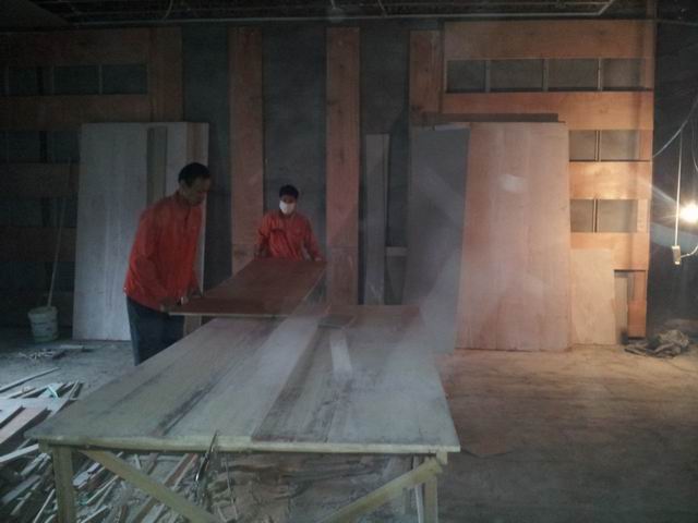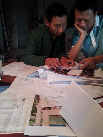 公裝部譚經(jīng)理正在和電工班組和木工班組討論施工細節(jié)