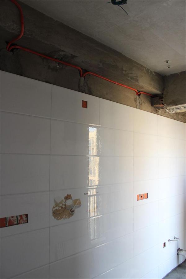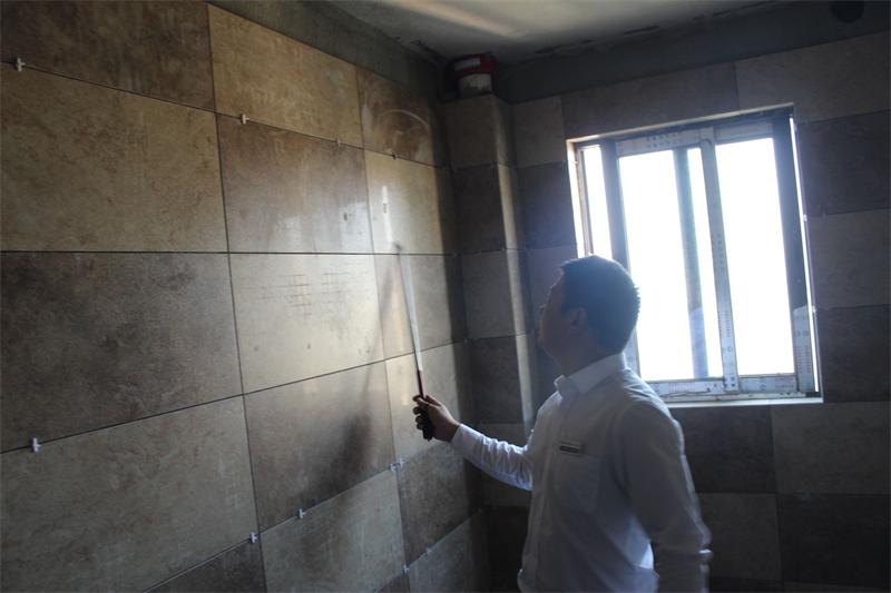 片區(qū)張經(jīng)理正在仔細(xì)檢查墻面貼磚情況